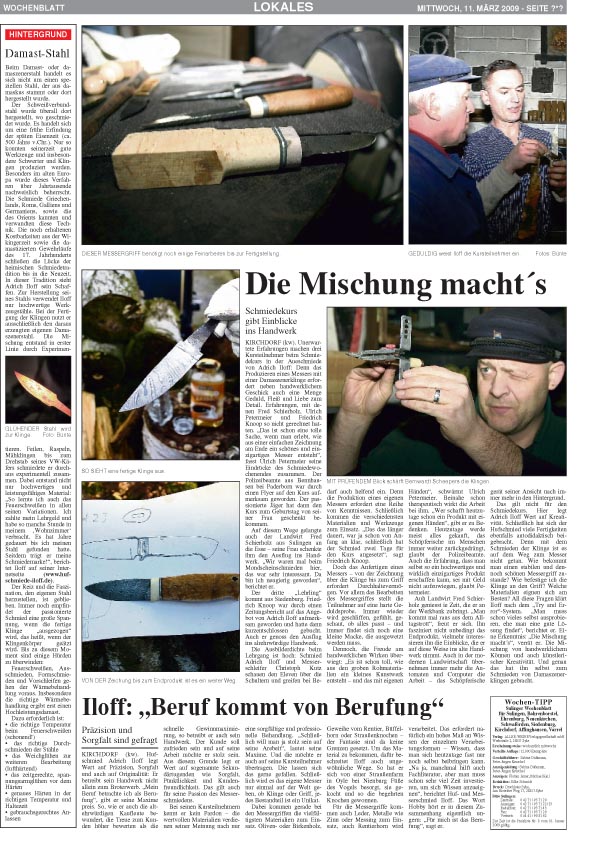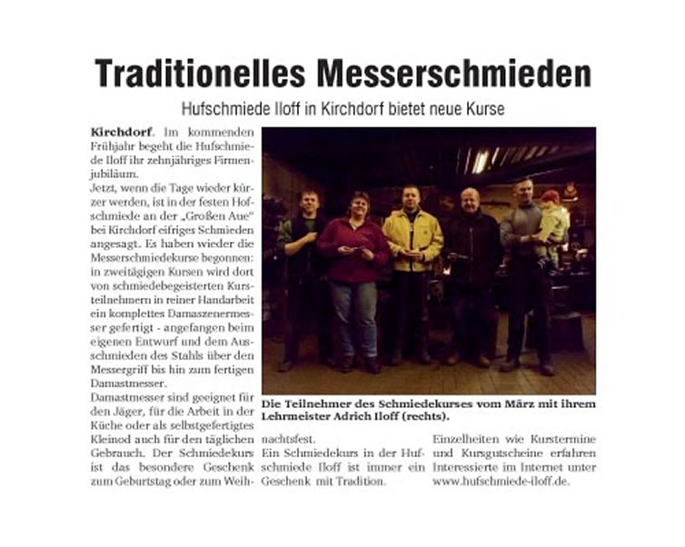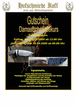 2. Damastschmiedekurs 2009 Freitag den 25. April 2009 um 13.00 Uhr Sonnabend den 26. April 2009 um 09.00 Uhr Jeder Teilnehmer nennt am Ende des Kurses ein selbstgefertigtes Damastmesser sein eigen! Teilnehmerzahl beschränkt ! (Gutschein zum Download) |