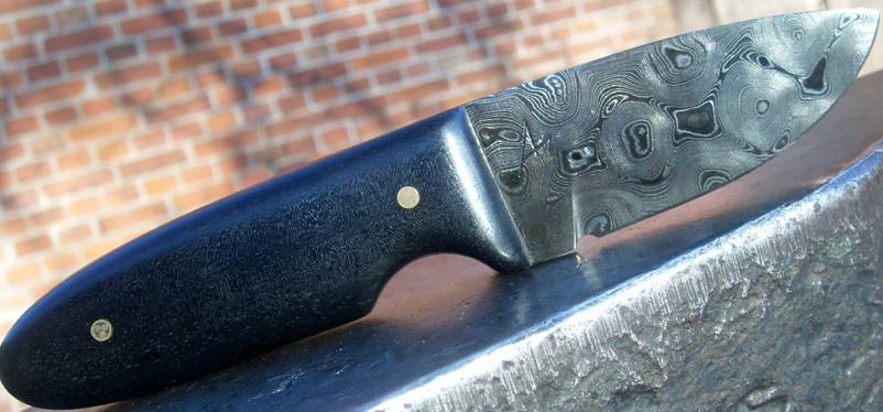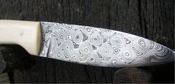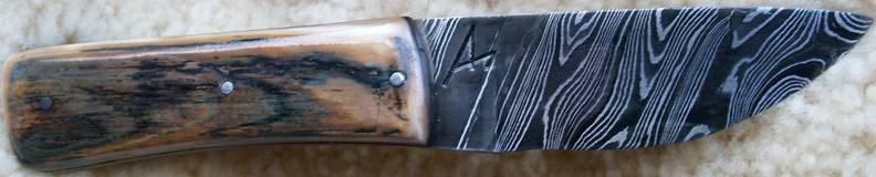 Probestück Dieses kleine Gebrauchsmesser ist das erste Messer aus meinem neuen Stahl. 50 - lagiger Torsionsdamast mit Griff aus Mammutelfenbein. Klingenlänge: 70mm, Klingenbreite: 20mm, Klingendicke: 3mm, Grifflange: 70mm